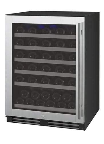 It holds 56 bottles across adjustable wooden shelves that slide out on ball-bearing tracks — a small detail that matters when you’re trying to read labels in a dark cabinet. The unit is front-venting and zero-clearance on the sides, so it can be built into cabinetry or run freestanding. At 23.5 inches wide, it fits a standard 24-inch undercounter cutout.