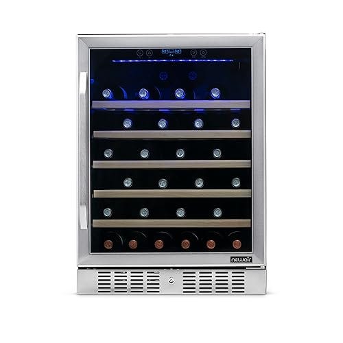 If you want serious bottle capacity without a serious price tag, the NewAir 52-Bottle stores an impressive collection in a unit that’s just 24 inches wide — no more room than a dishwasher. It’s a single-zone unit with digital temperature control ranging from 40–65°F, which works perfectly if you mostly drink one type of wine or store everything at a compromise temperature around 55°F.